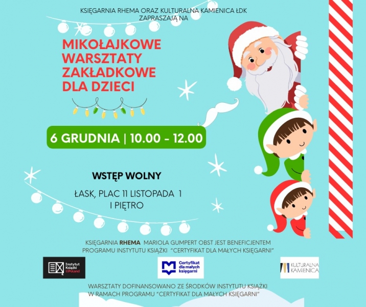 Księgarnia Rhema i Kulturalna Kamienica ŁDK zapraszają dzieci na warsztaty robienia zakładek do książek z mikołajowymi motywami.